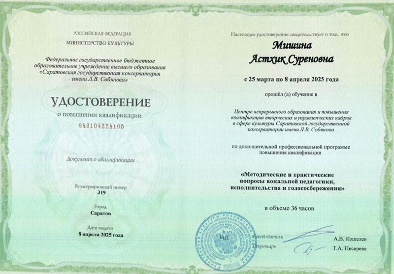 25.01.2021-03.02.2021г., ФГБОУВО «Саратовская государственная консерватория имени Л.В. Собинова» Удостоверение о повышении квалификации № 642411380055, регистрационный № 1946, в объеме (36 часов), дата выдачи: 03.02.2021 Национальный проект «Культура», федеральный проект «Творческие люди»
